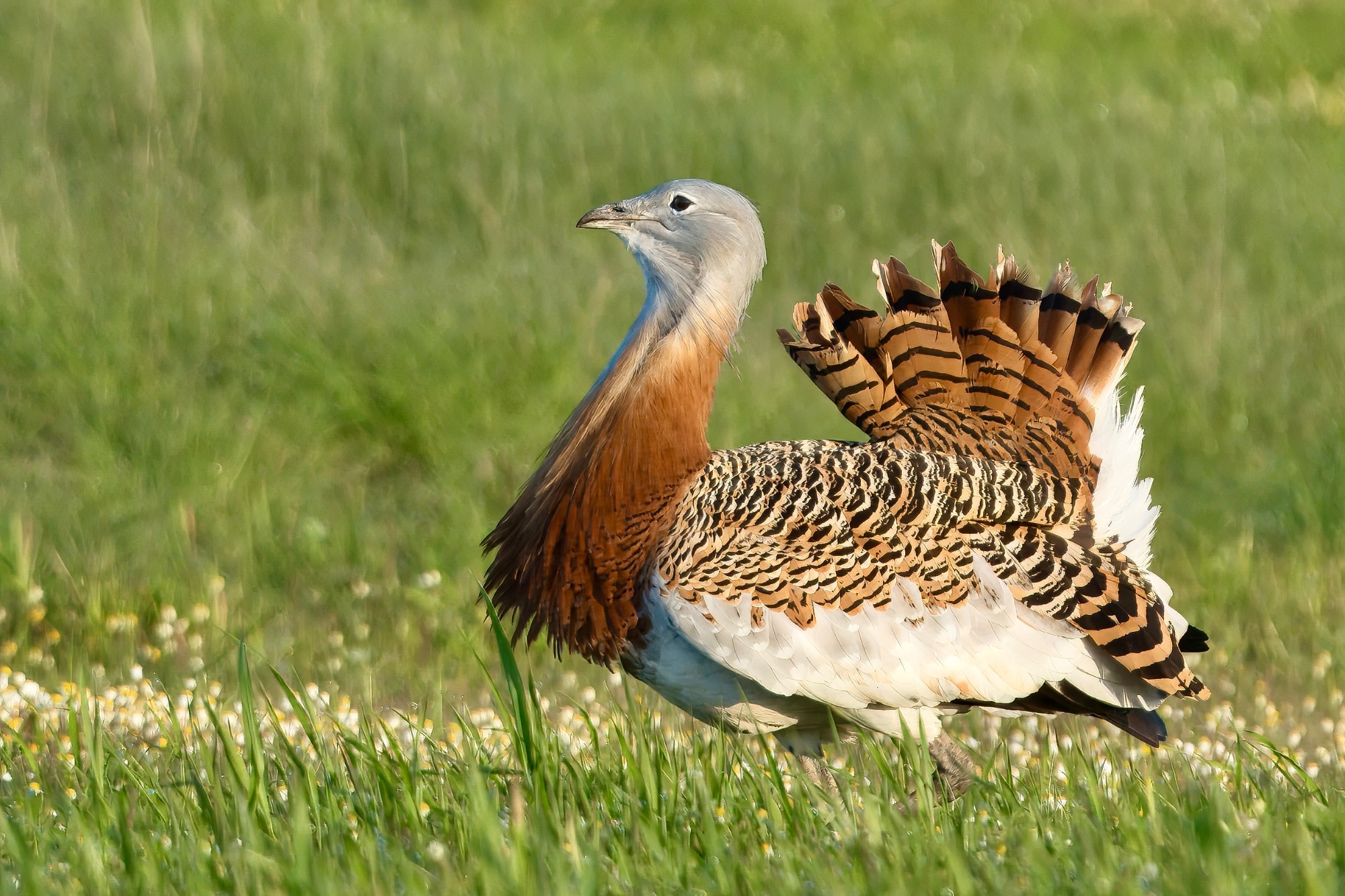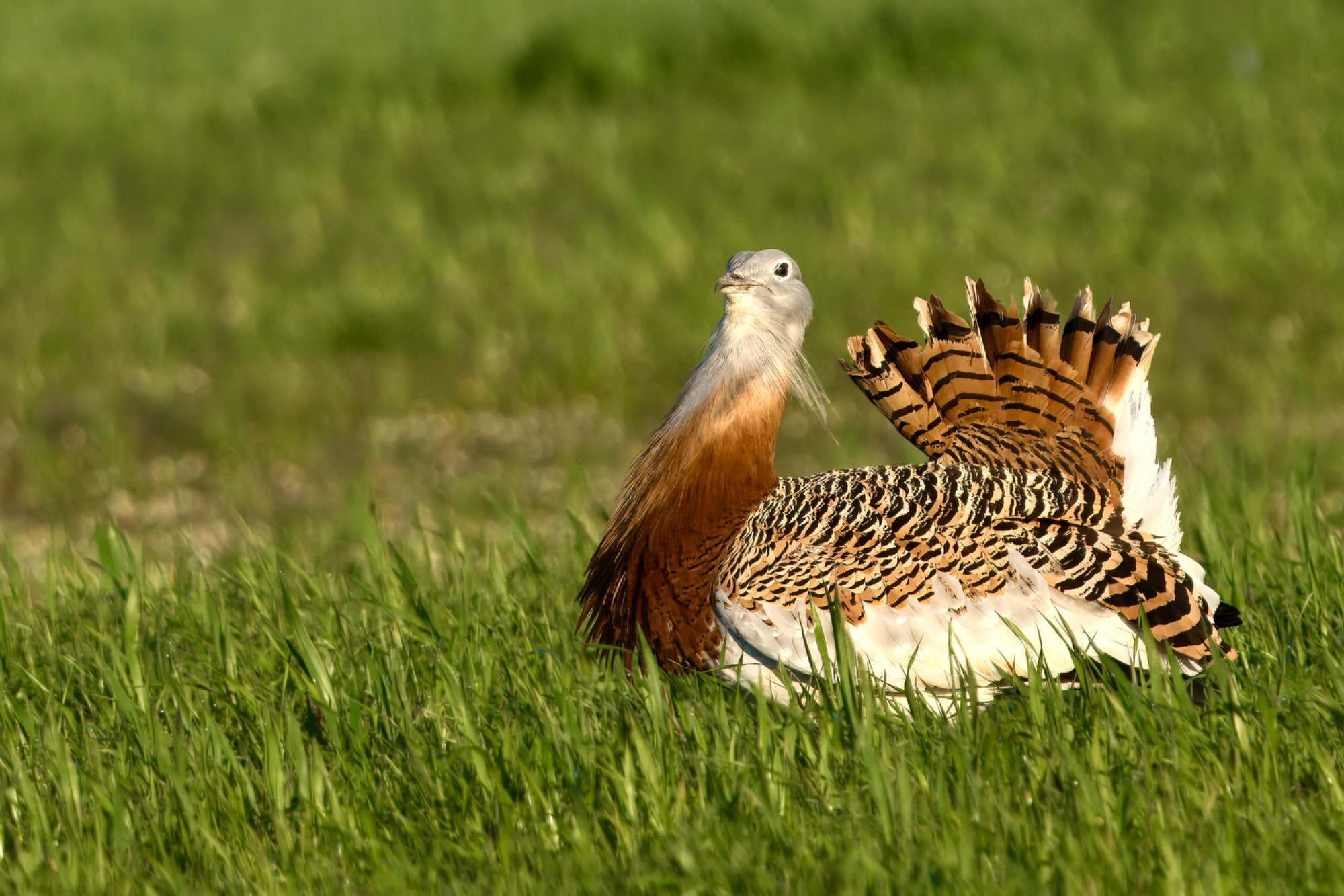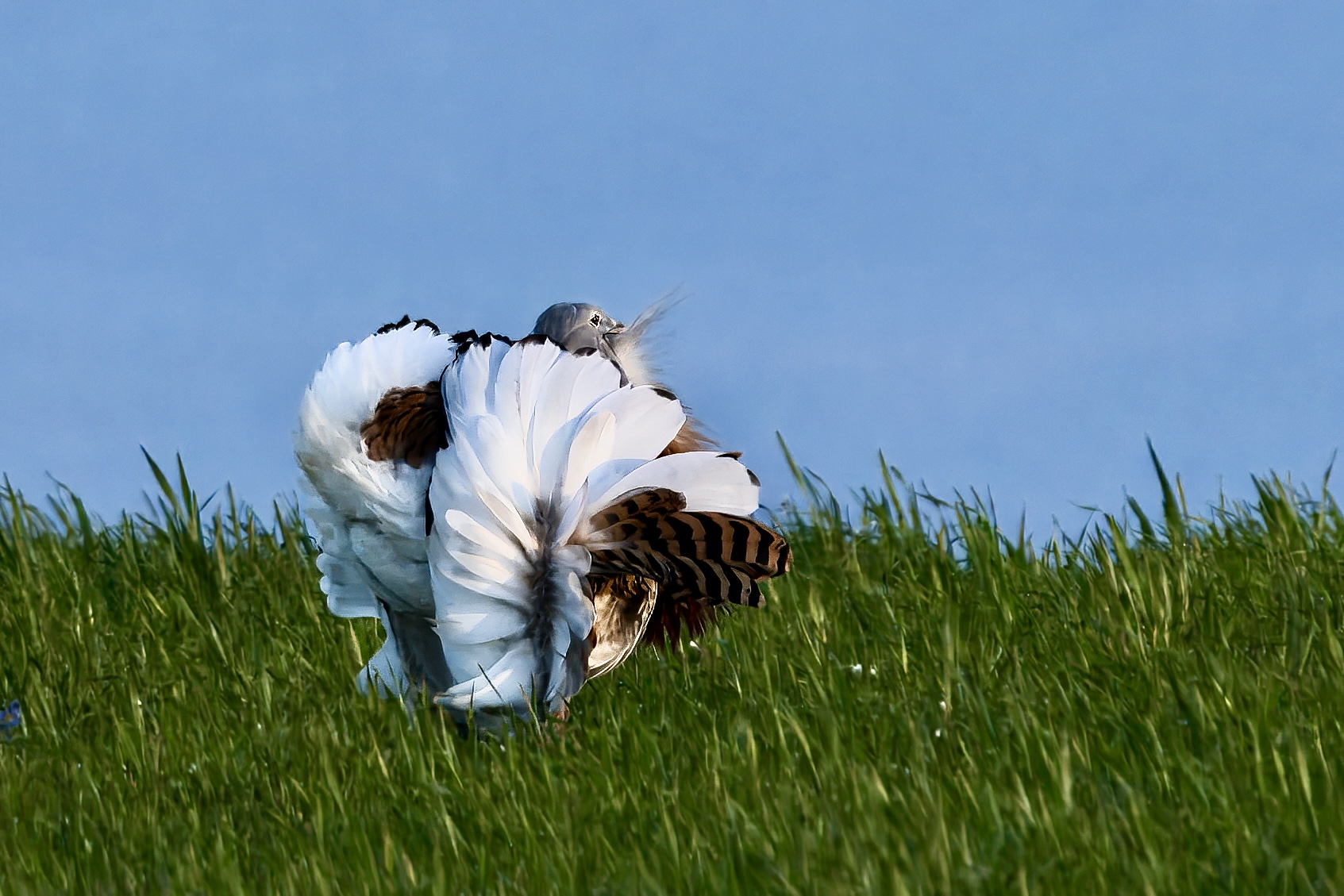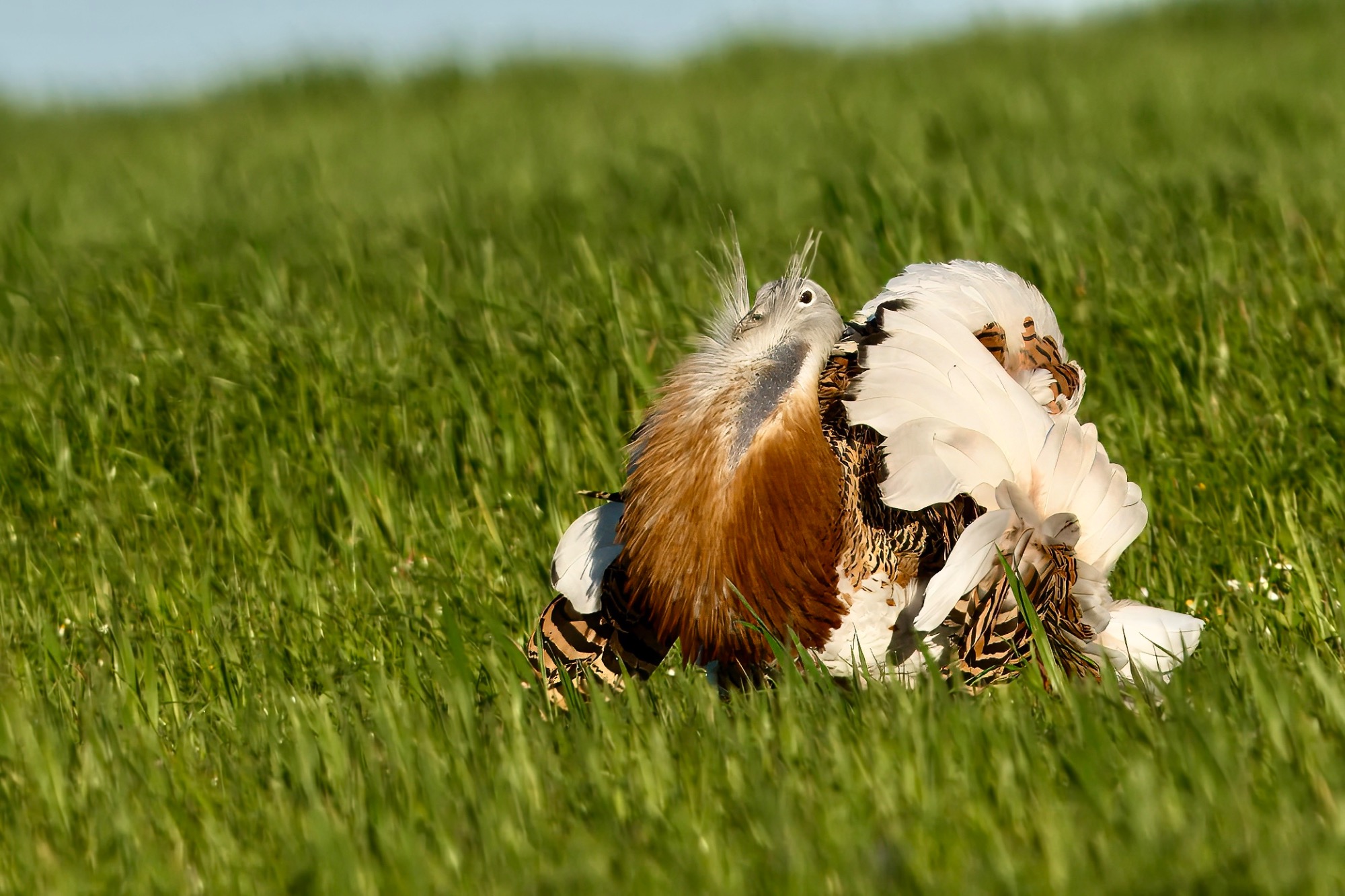 De hide is strategisch geplaatst op een locatie waar grote trappen zich regelmatig ophouden, met name tijdens de baltsperiode. Je fotografeert vanuit een laag standpunt, wat zorgt voor een mooi perspectief en een rustige achtergrond.