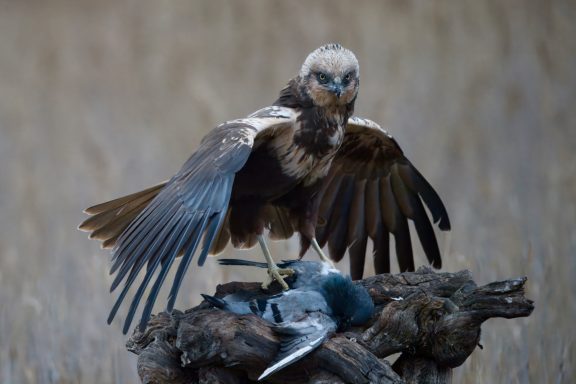 Deze hide biedt verrassend goede kansen op roofvogels. In het open landschap jagen en patrouilleren soorten als Bruine kiekendief, Blauwe kiekendief, Buizerd, Torenvalk en in de winter grote adelaar soorten. Tijdens trekperiodes zijn er ook andere soorten mogelijk. Ook komt er regelmatig een vos voorbij. Er zijn verschillende boomstronken geposteerd voor mooie opnamen.